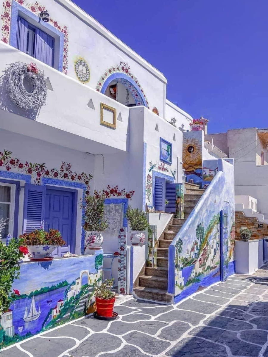 Il villaggio è collegato a Chora da un percorso panoramico di 15 minuti in auto attraverso dolci colline punteggiate di oleandri e timo selvatico. Le passeggiate serali sul lungomare sono perfettamente sicure, con le luci delle taverne che si riflettono sulle calme acque della baia.